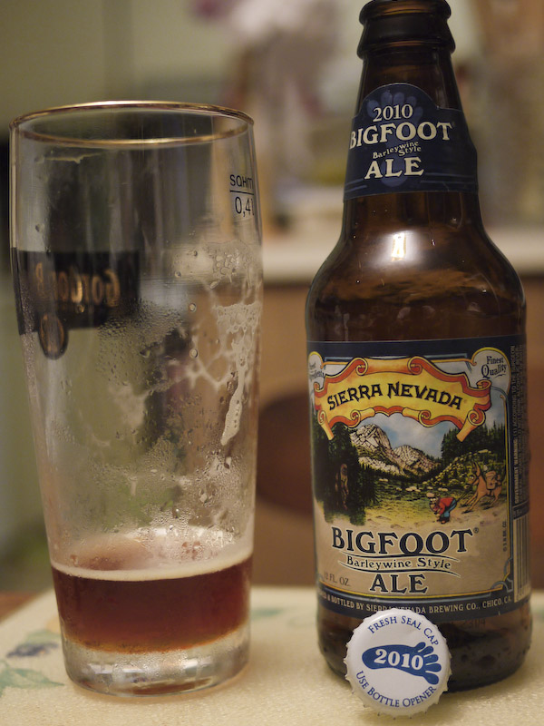 Popped into the newly remodeled and opened Foodland Farms at Aina Haina. It’s kind of a mini “Whole Paycheck” market. They borrowed a lot of aspects with the areas of higher end products, deli, and prepared foods, but not quite as extensive. The beer selection is also pretty good with some items I haven’t seen elsewhere, but again is nowhere as extensive as Whole Foods. What I did spy was this Sierra Nevada Bigfoot Ale. With a name like that I simply could not resist. Pours with a pretty strong head, simply popping the cap produced bubbles in the bottle neck. Color is a medium dark somewhat cloudy amber. Immediate floral aroma without even taking a sip. It is strongly hoppy, the bitter hits you from the begining, it’s no aftertaste here! I guess Bigfoot like drinking flowers?