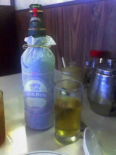 On the Friday before the Lunar New Year, I stopped by Kin Wah Chinese Restaurant for dinner. For the New Year, they had a special on Harbin Lager. I had never tried one of these before, so I gave it a shot. There was no indication of size on the ad, so I was initially shocked by the 600ml size. Flavor-wise, I was expecting a vile, overly-hopped, Pilsen-esque Heineken clone along the lines of a Tsingtao, but was pleasantly surprised with something wonderful. The initial mouth feel was dry not unlike a Japanese lager, but with more bittering hops. This gave it more of a Pilsen-like first flavor, but the middle had a distinct, full malt flavor like a Bavarian lager. The finish was clean. This was a good, refreshing, easily drinkable beer. I later called Fabio to tell him about it, and he stunned me with the revelation that Harbin fell under Anheuser-Busch ownership in 2004. Oh man… well, I guess if that wasn’t the case, I probably wouldn’t have had the chance to try it in the States!