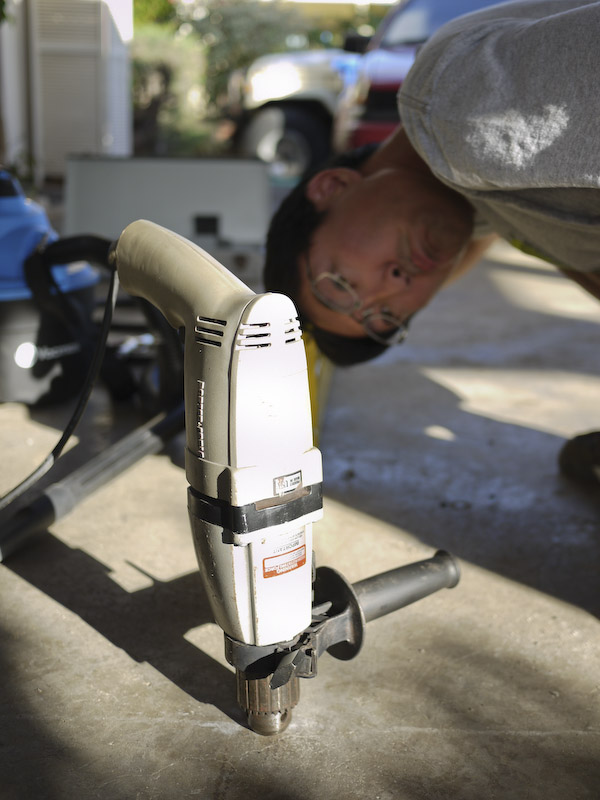 In the course of the week, I found some conrete anchors in stainless steel that will work. Drop in style which are shallower, but I needed to go up a size to somewhat match the weight holding capacity. Saturday Derek came over to resume this project and we proceeded to drill out the first hole to the larger size needed.