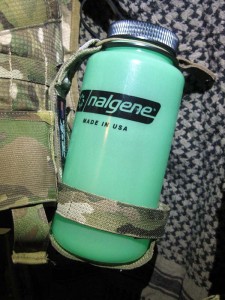 The holder is stiffer than a fabric pouch because of its webbing construction. Because of this, if there is no bottle in it, the bottom loop still stands proud of the pack and has the potential to snag on things. There is also a somewhat high-signature label on the outside surface of the body of the holder that is visible when a bottle is not present. The label is not a big deal, since this isn’t a combat item where minmizing observability is critical. Heck, I’m running a glow-in-the-dark Nalgene bottle in it! A black label is nothing!