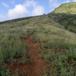 The Koko Crater “Stairs” trail was as busy as expected. In recent times I’ve seen a trail paralleling the tracks become prominent and heard rumours from someone at the shooting range that mountain bikers were riding it. I’d heard back when the new BMX jumps were being built that guys on bikes were making a side trail with jumps but that it was discontinued when parks officials told them it was too exposed to the range. I don’t know if this is a part of that, but it’s a real obvious trail now. Since the range was closed and I still had more than hour before sunset, I decided to check it out.